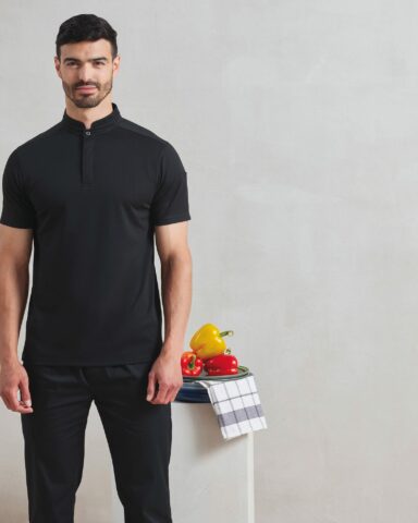 100% recycled polyester. With press stud collar and mandarin collar. A covered button placket conceals two press studs.