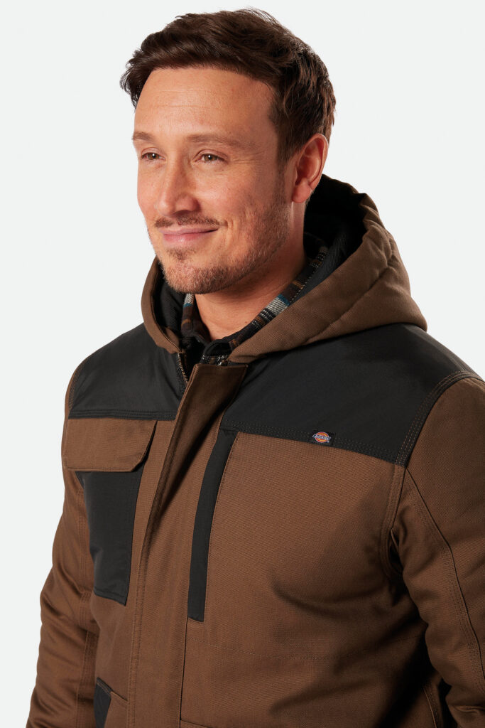 100% polyester in Duck Tough Max™ fabric. Durability, comfort and protection. The jacket features a concealed storm flap, sealed seams and an oil- and water-based water-repellent coating. Backing at the main points. Comfort pleats at the armpits. Chest pocket. Inside pocket. Hood. Standard, relatively close fit for greater freedom of movement.