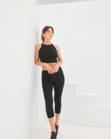 96% cotton/4% elastane. Single jersey. 3/4 length leggings with elasticated waist. Twin needle stitched seams.