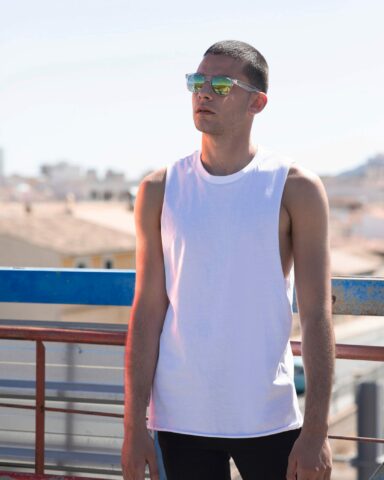 60% cotton / 40% polyester. Men’s tank top with stretch ribbed crew neck and raw-edge armholes for a modern, casual look. Detachable label for easy re-branding.