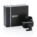 New generation true wireless earbuds. The earbuds and charging case are made with RCS (Recycled Claim Standard) certified recycled ABS. Total recycled content: 59% based on total item weight. RCS certification ensures a completely certified supply chain of the recycled materials. The earbuds come in a compact 400 mAh charging case that allows you to charge and take your earbuds wherever you go. The earbuds use BT 5.3 for automatic pairing without any hassle and with a stable connection. The earbuds have a 40 mAh battery that allows a play time of up to 4 hours and can be re-charged in 1.5 hours in the charging case. The wireless distance range is up to 10 metres. Including type C charging cable made from GRS certified recycled TPE. Packed in FSC® mix gift box. Item and accessories 100% PVC free