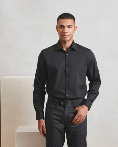 65% recycled polyester / 35% cotton. Formal stiff collar and top button shirt fastening. Double-breasted wrist cord with cufflink hole and single-button sleeve guard for easy turn-up option.