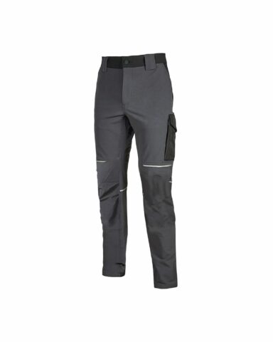Trousers made from U-4 fabric (U-Power 4 way stretch), combining comfort, resistance and softness to the touch, while being water repellent and breathable. Elasticated at the waist with an invisible tightening system, multiple functional pockets, including a tool pocket and hidden zipped pockets. With a rear bib for optimum lumbar support and a reinforced cuff in 300D polyoxford, these Slim Fit trousers are designed to combine functionality and protection.