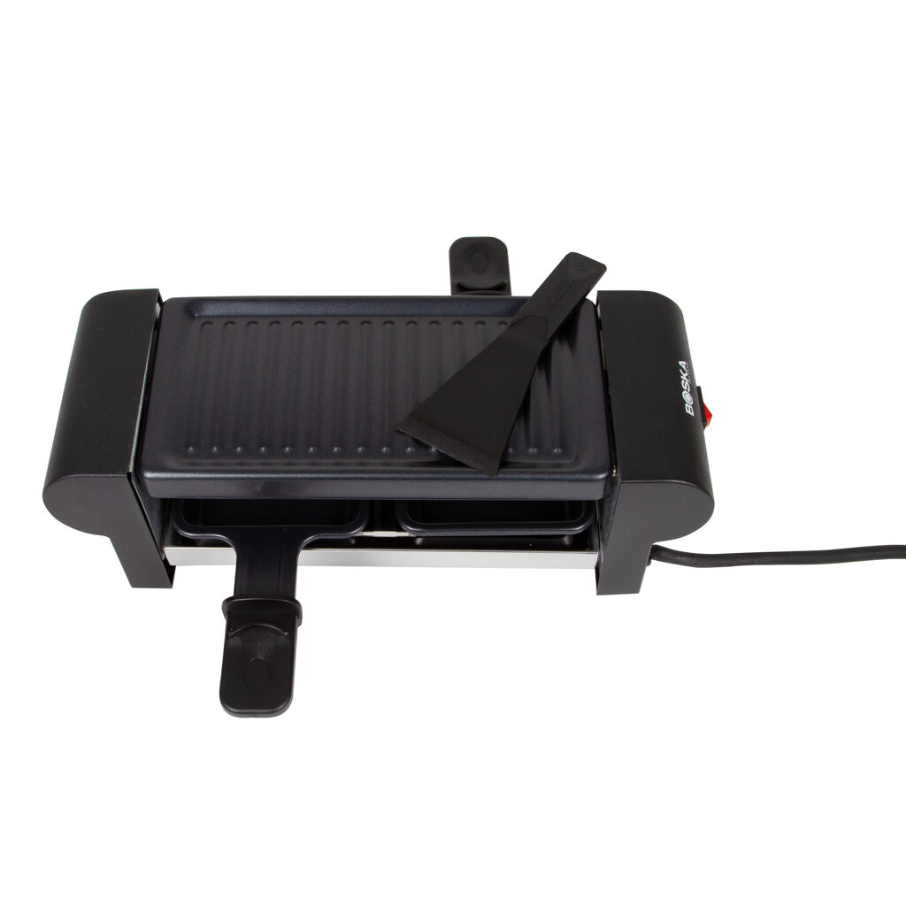 Mini appareil à raclette 220V de la marque BOSKA, certifiée B Corporation, transforme chaque repas en une expérience culinaire conviviale. Idéal pour deux personnes, cet ensemble compact avec cordon (230 V, prise de type F) vous permet de faire fondre du fromage et de griller légumes, viandes ou même mini-crêpes en toute simplicité. Il comprend deux poêles et spatules antiadhésives, et son design compact facilite son rangement après utilisation. Conçu pour un usage quotidien, cet appareil à raclette allie fonctionnalité et durabilité. Il est partiellement compatible lave-vaisselle ; seules les petites poêles et spatules le sont également. De plus, il est garanti 10 ans. Les composants électriques sont garantis 2 ans.