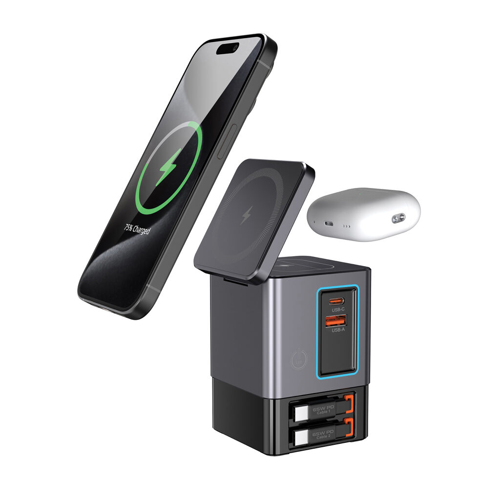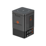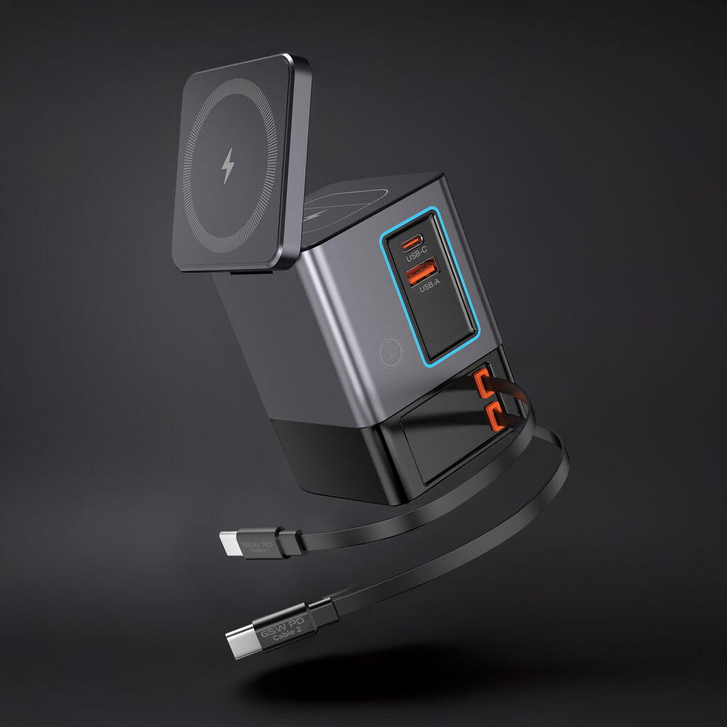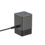 Sacramento est une station de charge GaN de 105 W , dotée de deux câbles USB-C 65W rétractables intégrés, pour que vous ayez toujours une charge rapide à portée de main – aucun câble supplémentaire n’est nécessaire. Besoin de plus d’options ? Sacramento comprend également un port USB-A et USB-C, ce qui vous donne un total de quatre options de sortie pour charger des ordinateurs portables, des tablettes, des smartphones et plus encore, le tout en même temps. Et pour vos appareils sans fil, Sacramento est équipé d’un puissant chargeur sans fil de 15 W qui maintient votre téléphone en place en toute sécurité, ainsi que d’un pad sans fil séparé conçu spécifiquement pour les petits objets tels que les écouteurs ou les AirPods (5W max).Sacramento est fabriqué avec du PC ignifugé recyclé certifié RCS (Recycled Claim Standard). Contenu recyclé total : 26 % sur la base du poids total de l’article.