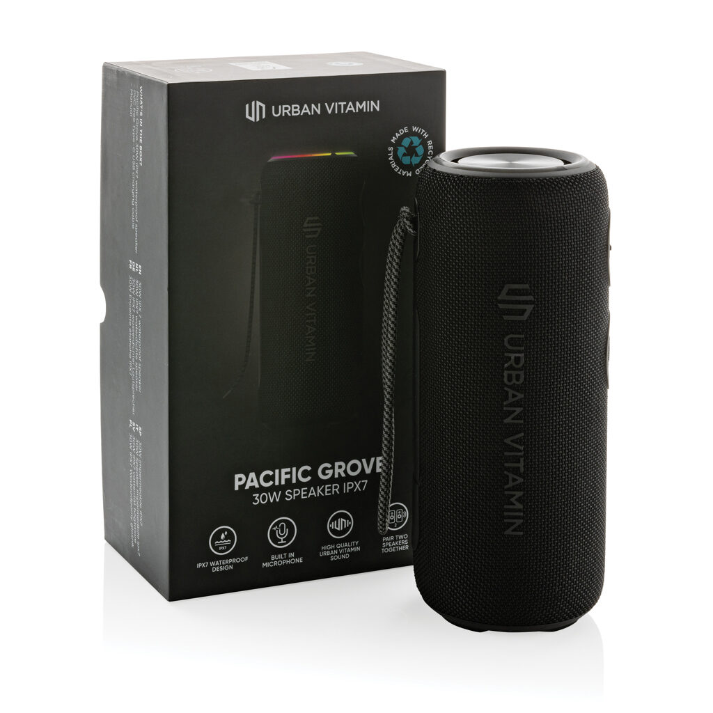 Haut-parleur 30W sans fil Pacific Grove fabriquée à partir d’ABS et de PET recyclés certifiés RCS (Recycled Claim Standard). Son cordon intégré pratique et sa conception durable, résistante à l’eau IPX 7, vous permettent d’emporter vos morceaux préférés où que vous alliez. En outre, vous avez la possibilité de connecter deux haut-parleurs ensemble à l’aide de la fonction de couplage stéréo, créant ainsi une expérience sonore stéréo authentique. Une charge complète vous permet d’écouter de la musique jusqu’à 8 heures avec une seule charge. Le double subwoofer vous offre une expérience inégalée en matière de basses. Contenu recyclé total : 36 % sur la base du poids total de l’article. La certification RCS garantit une chaîne d’approvisionnement entièrement certifiée pour les matériaux recyclés. Les articles Urban Vitamin sont fabriqués sans PVC et emballés dans des emballages à teneur réduite en plastique.