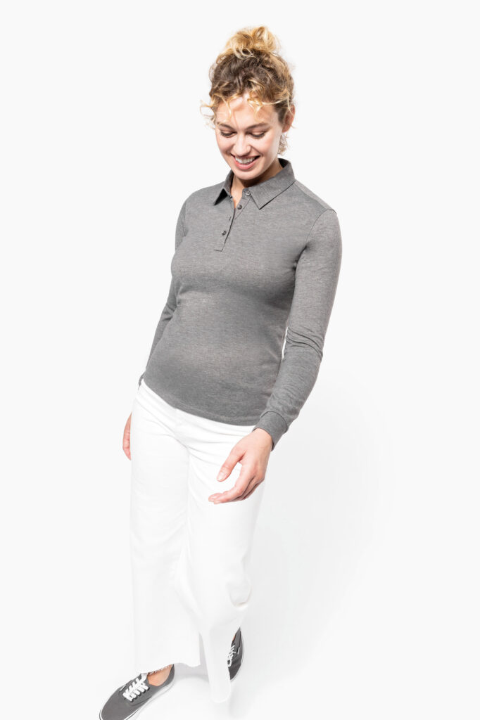100% coton (Grey Heather : 65% polyester / 35% coton – Oxford Grey : 90% coton / 10% viscose). Maille jersey en coton peigné. Col chemise. Patte de boutonnage col 4 boutons métal. Empiècement épaule. Poignet en bord-côte. Double aiguille bas de vêtement.