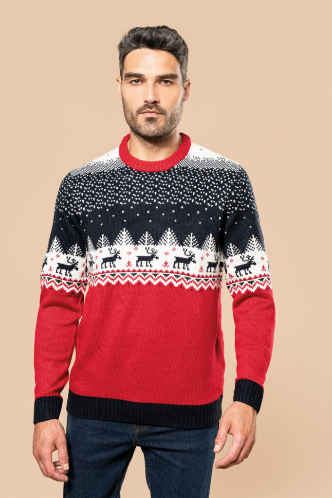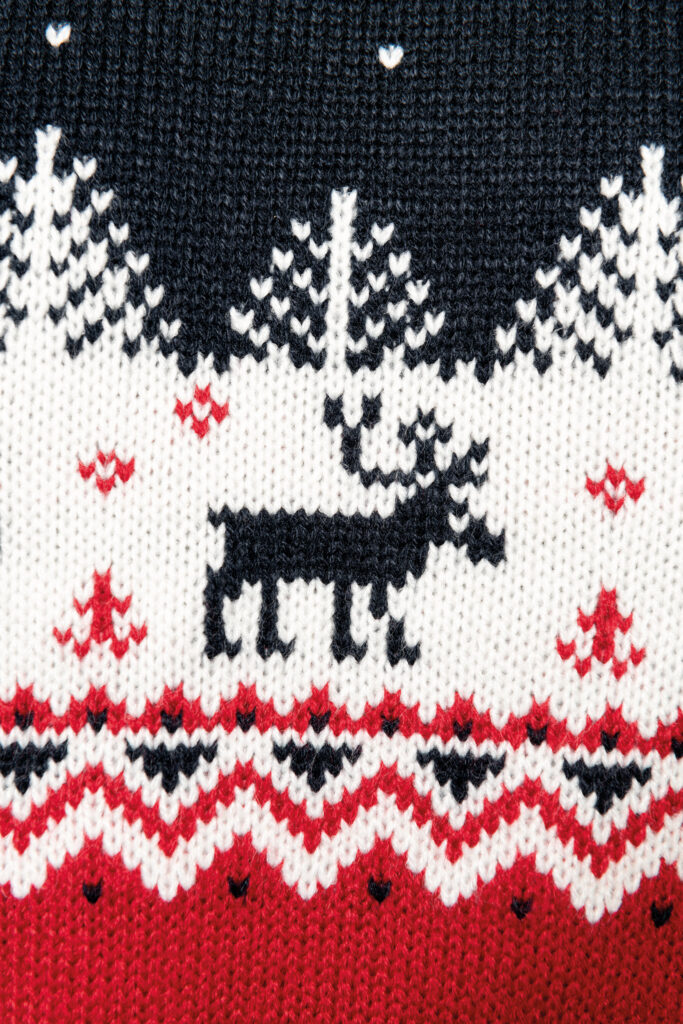 100% acrylique. Coupe ajustée. Jauge 5. Tricot intarsia à motifs de Noël devant, dos et sur les manches. Tricoté en fully fashion : tricoté dans la forme et assemblé sur machine de remaillage. Col rond. Finitions bord côte 2×2 contrastés à l’encolure, poignets et bas de vêtement. Bande propreté ton sur ton avec la couleur majoritaire. Présence d’élasthanne dans le bord côte bas de manche et bas de vêtement pour éviter que le pullover se déforme. Pas d’étiquette de marque au col, uniquement une puce de taille pour faciliter la personnalisation.