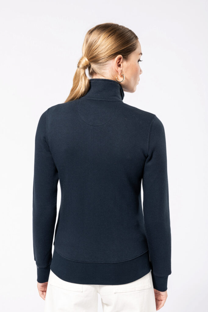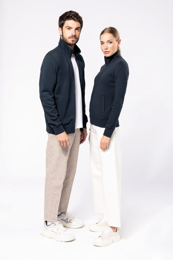 80% coton / 20% polyester. Surface extérieure 100% coton. Traitement LSF (Low Shrinkage Fleece : molleton prérétréci). Molleton gratté 3 fils en coton peigné. Coupe ajustée. Manches droites. Col montant. Fermeture zippée plastique ton sur ton. 2 poches zippées et passepoilées côté. Finition demi-lune à l’encolure dos pour faciliter la personnalisation de marque à l’intérieur col. Finition bord-côte 1×1 bas de manches et de vêtement. Etiquette de marque Tear Away.