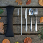Herbruikbare roestvrijstalen bestekset die je gemakkelijk overal mee naartoe kunt nemen en perfect voor als je je lunch mee naar je werk neemt. Deze set bevat een vork, mes, lepel, rietje en borstel, zodat je het rietje kunt schoonmaken. Alle items passen in het neopreen etui met rits en sluitkoord. Geschikt voor de vaatwasser.