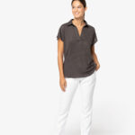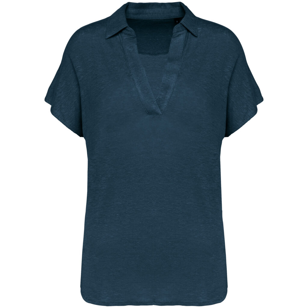 100 % Linnen. Fitted pasvorm met afhangende mouwen. Zijsplitten met een driehoekje. Polokraag met staander en V-hals met knooplijst zonder knoop in de hoofdstof. Dubbel stiksel aan de mouwboorden en de zoom. Halvemaan op de achterkant.
