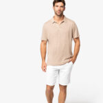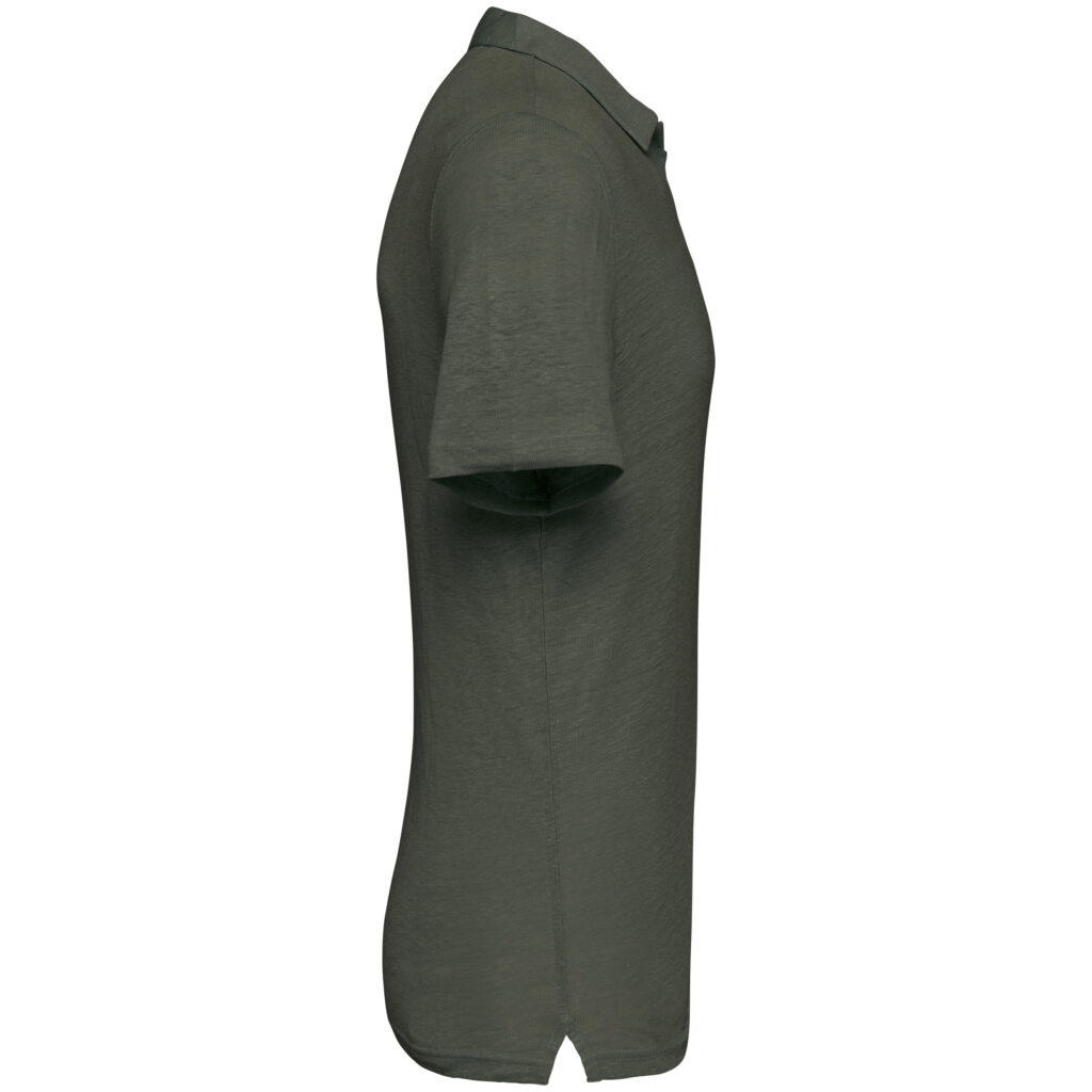 100 % linnen. Fitted pasvorm. Polokraag met staander en V-hals. met knooplijst zonder knoop in de hoofdstof. Dubbel stiksel aan de mouwboorden en de zoom. Zijsplitten met aan de binnenkant nektape in de hoofdstof. Halvemaan op de achterkant.