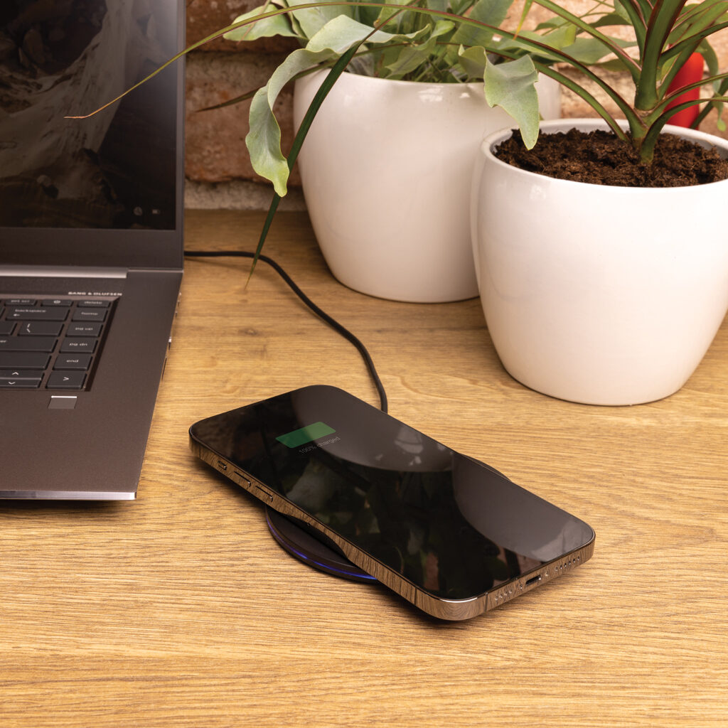 Ultrasnelle draadloze oplader van 15W gemaakt met RCS (Recycled Claim Standard) gecertificeerd gerecycled ABS. Totaal gerecycled materiaal: 66% op basis van het totale gewicht van het item. RCS-certificering zorgt voor een volledig gecertificeerde toeleveringsketen van de gerecyclede materialen. Draadloos opladen compatibel met de nieuwste Android-generaties, iPhone 8 en hoger. Artikel en accessoires PVC-vrij. Inclusief 120 cm type C laadkabel gemaakt van RCS gecertificeerd gerecycled TPE. Verpakt in FSC® mix kraft doos. Type-C input 5V/2A; 9V/2A;12V/1.5A; Draadloze output 5V/1A;9V/1,1A; 9V/1.67A (15W)