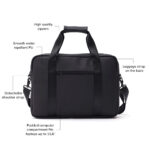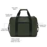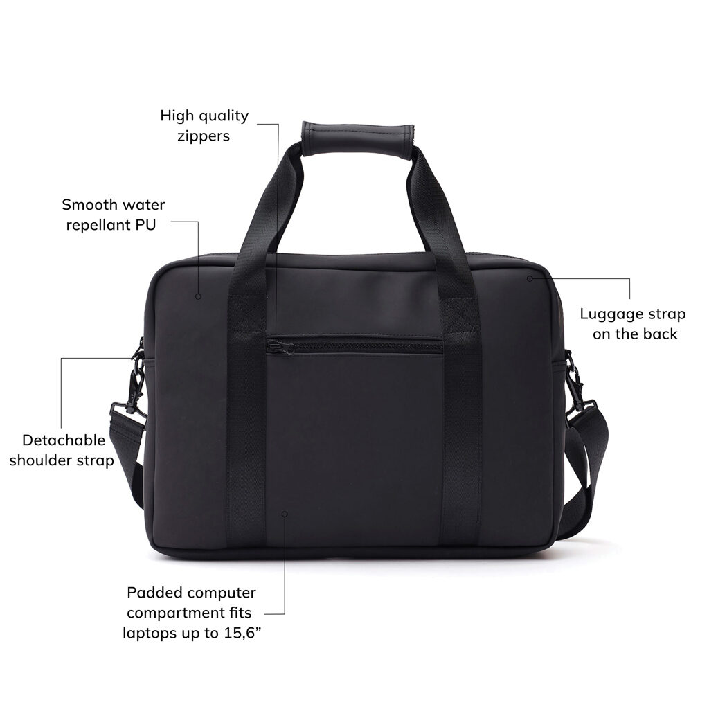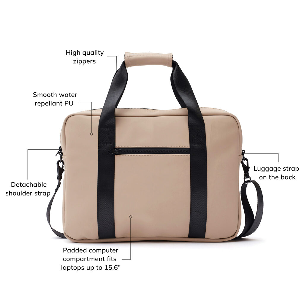 Deze moderne en stijlvolle laptoptas zal zeker veel bekijks hebben. Het is een trendy, maar ook zeker een heel functionele draagtas. Naast het opberg vak voor je computer zitten er aan de binnenkant nog verschillende andere vakken, waarin je pennen, documenten of andere spullen kunt opbergen. De tas is gemaakt van een waterafstotend materiaal en met de dubbele handgrepen en de afneembare schouderriem kun je hem comfortabel bij je dragen. De laptopcase heeft ook een gesp, zodat deze gemakkelijk aan uw handbagage kan worden bevestigd als je op reis gaat.Geschikt voor laptops met een grootte van in totaal 17 inch. Denk eraan dat de afmetingen van het scherm niet hetzelfde zijn als die van de gehele laptop.