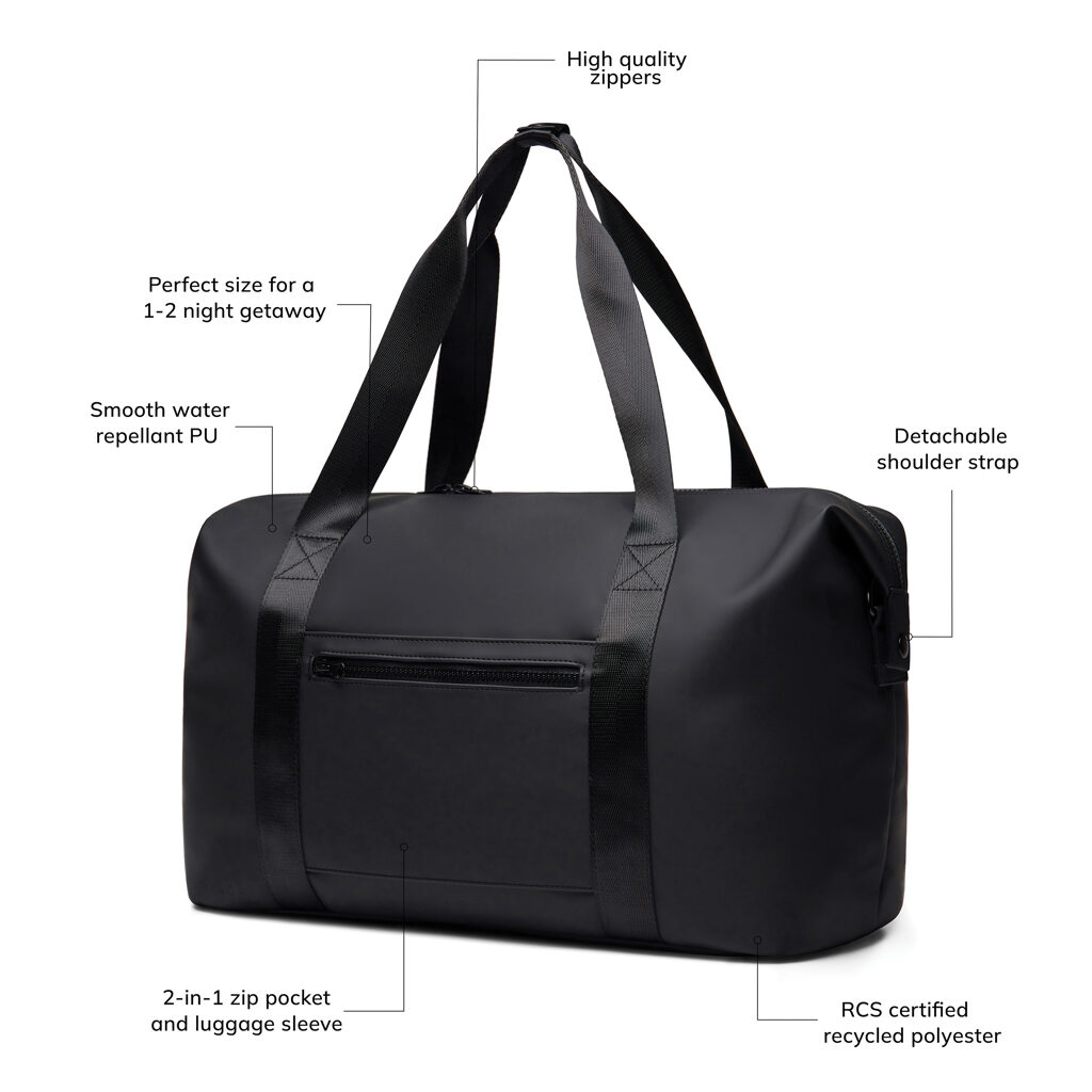 Een weekendtas in reisformaat, gemaakt van gedeeltelijk RCS-gecertificeerd recycled polyester met een gestroomlijnde PU-coating. Ontworpen om alles in op te bergen wat je nodig hebt voor een uitstapje van 1-2 nachten. Maak je tas eenvoudig vast aan je trolley met een slim 2-in-1 ritsvak. Met zowel comfortabele handgrepen als een afneembare verstelbare schouderriem. Binnenin een kleiner ritsvak voor je benodigdheden. RCS-certificering garandeert een volledig gecertificeerde toeleveringsketen van gerecyclede materialen. Totaal gerecycled materiaal: 20% gebaseerd op het totale gewicht van het artikel.