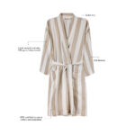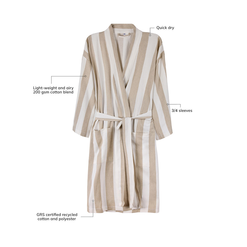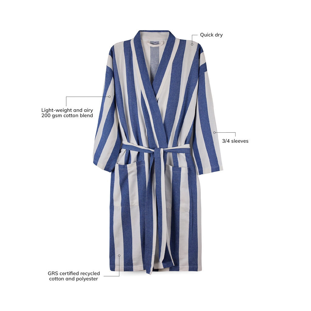 Neem deze zachte en comfortabele hamam badjas mee naar het strand of geniet er gewoon thuis van. Hij is gemaakt van een lichtgewicht en luchtige 200 grams mix en combineert het comfort van katoen met de sneldrogende voordelen van polyester. Ontworpen in een klassieke stijl met een tweekleurig gestreept patroon en voorzien van een nette kraag, voorzakken, 3/4 mouwen en een tailleband voor een perfecte pasvorm. Gecertificeerd door GRS (Global Recycled Standard), GRS certificering garandeert dat de hele toeleveringsketen van de gerecyclede materialen gecertificeerd is. De totale gerecyclede inhoud is gebaseerd op het totale productgewicht. Dit product bevat 69% GRS-gecertificeerd gerecycled katoen en 29% GRS-gecertificeerd gerecycled polyester.